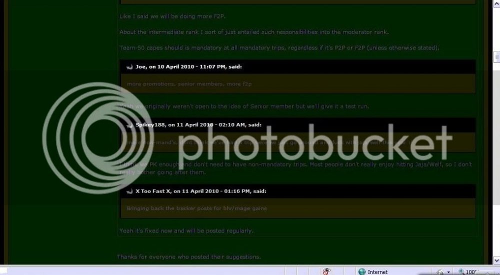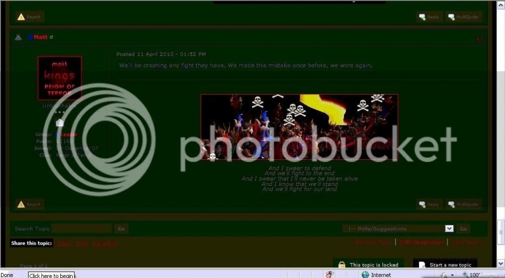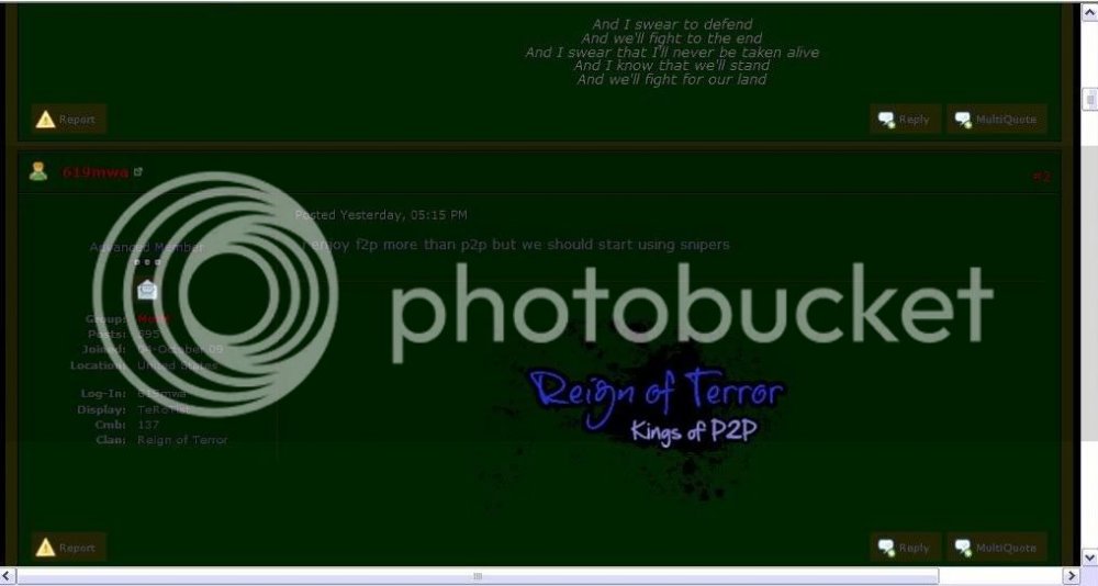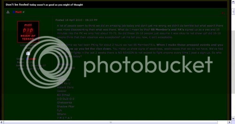 h0z Report post Posted April 25, 2010 Yea, deeper inside the Reign of Terror's. Courtesy of our latest recruit Deadmeat290, a RoT Senior member and a loyal spy. Spies never make it to FA because we have probably the most thorough application system around. After the 25 or so days it takes to get FA' date=' most spies will have been caught.[/quote'] ^^ Try 5 months pal. Two down MattyB, stay alert. Enjoy but try 5 days not 5 months, not much to comment on despite the fact that we're better than you every single way possible lol. Must have been hard telling your members the real reason why you had to end as soon as we began massing especially when you have 90 people ;$ . Share this post Link to post Share on other sites 0